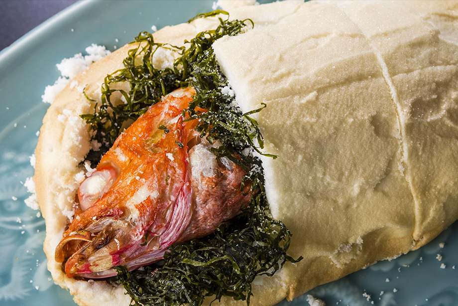 他ではなかなか食べることのできない、海鮮を使用した真新しい名物料理をご提供しています。(写真は自分で岩塩を叩き割っていただくきんきの塩釜焼きです)